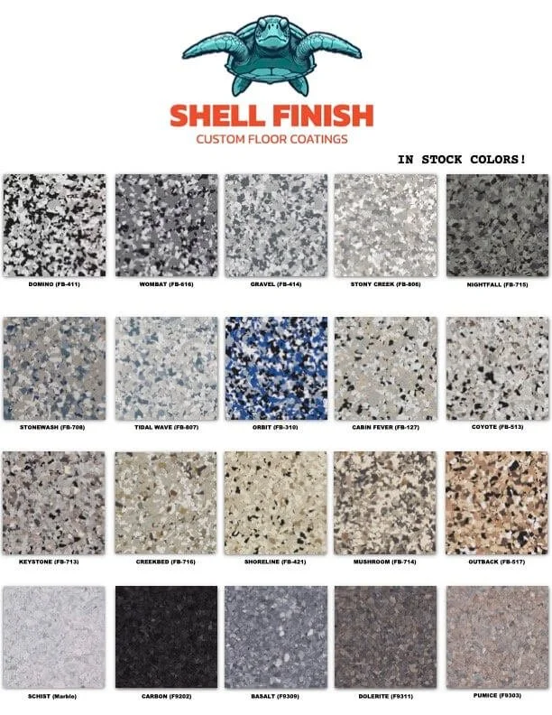 See all our color options for flake floors below. Don’t see what you want? Let us know! We can custom order just about anything, just keep in mind custom orders may have an additional fee and may delay the date we can begin.